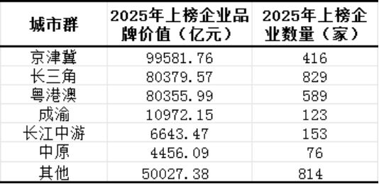 上市公司作为各城市群的“核心资产”,其作用愈发凸显。上市公司的品牌价值,更是衡量城市群企业品牌活力与实力的重要标尺。