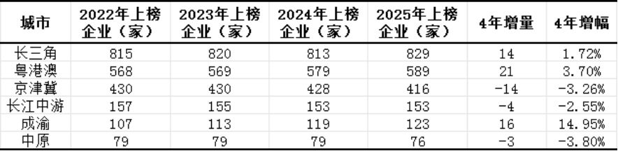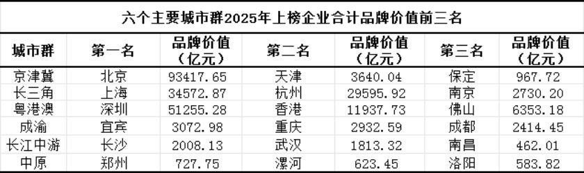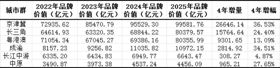 2022年至2025年,六个主要城市群的上榜企业合计品牌价值均出现上涨。
