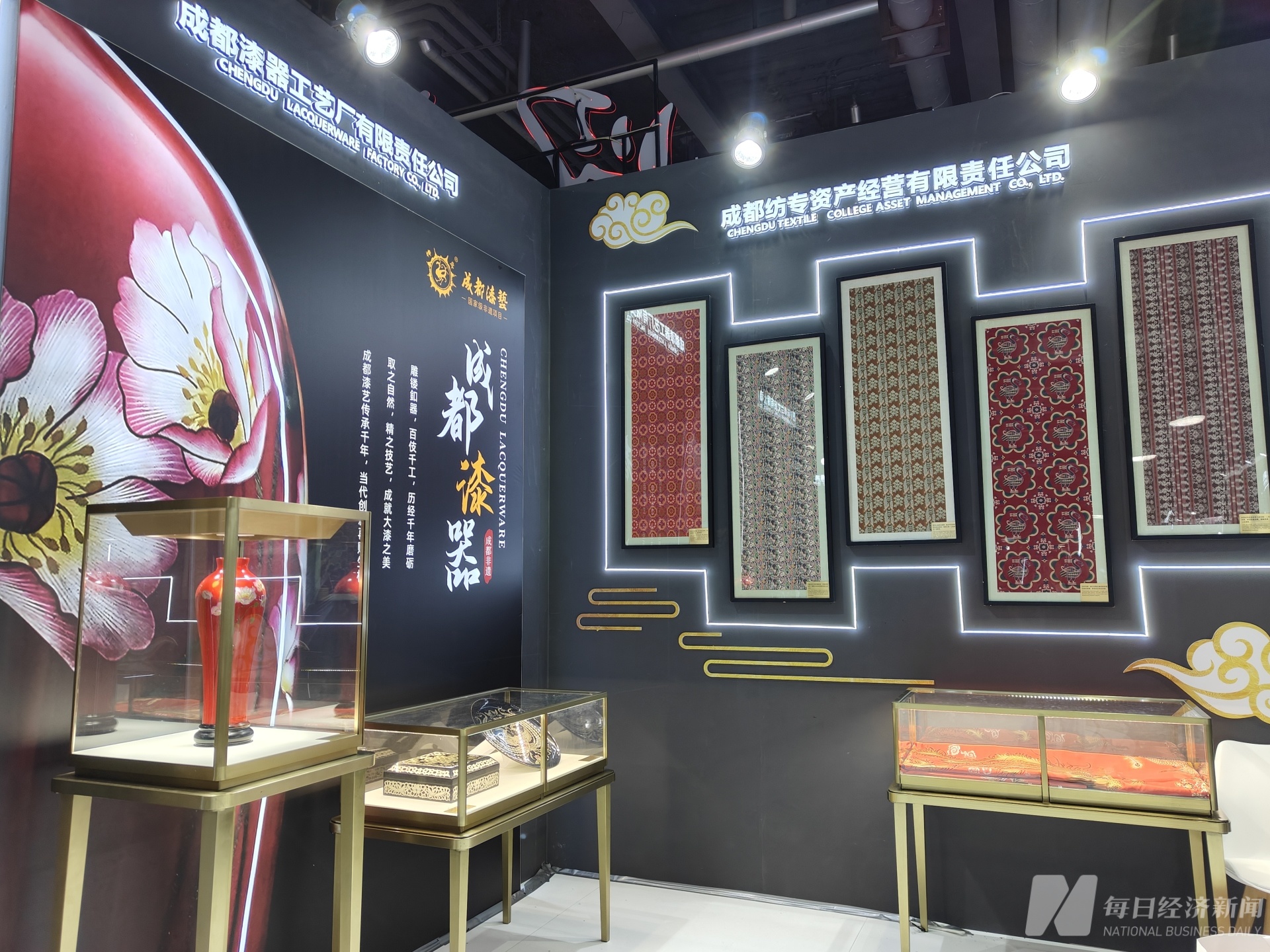 目光所及之处,蜀锦蜀绣、漆器银饰共同绘就了一幅非遗长卷。成都纺专带来的八达晕锦与五彩鸟锦,纹样古雅,承载着千年织造的历史回响;成都漆器厂的漆器,制作中坚守“双纯”古法,“老中青”代代相传,让这项国家级非遗历久弥新;雁鸿工作室的山海经花丝六方瓶,则以银花丝为笔,勾勒古老神话,令八方来客叹为观止。