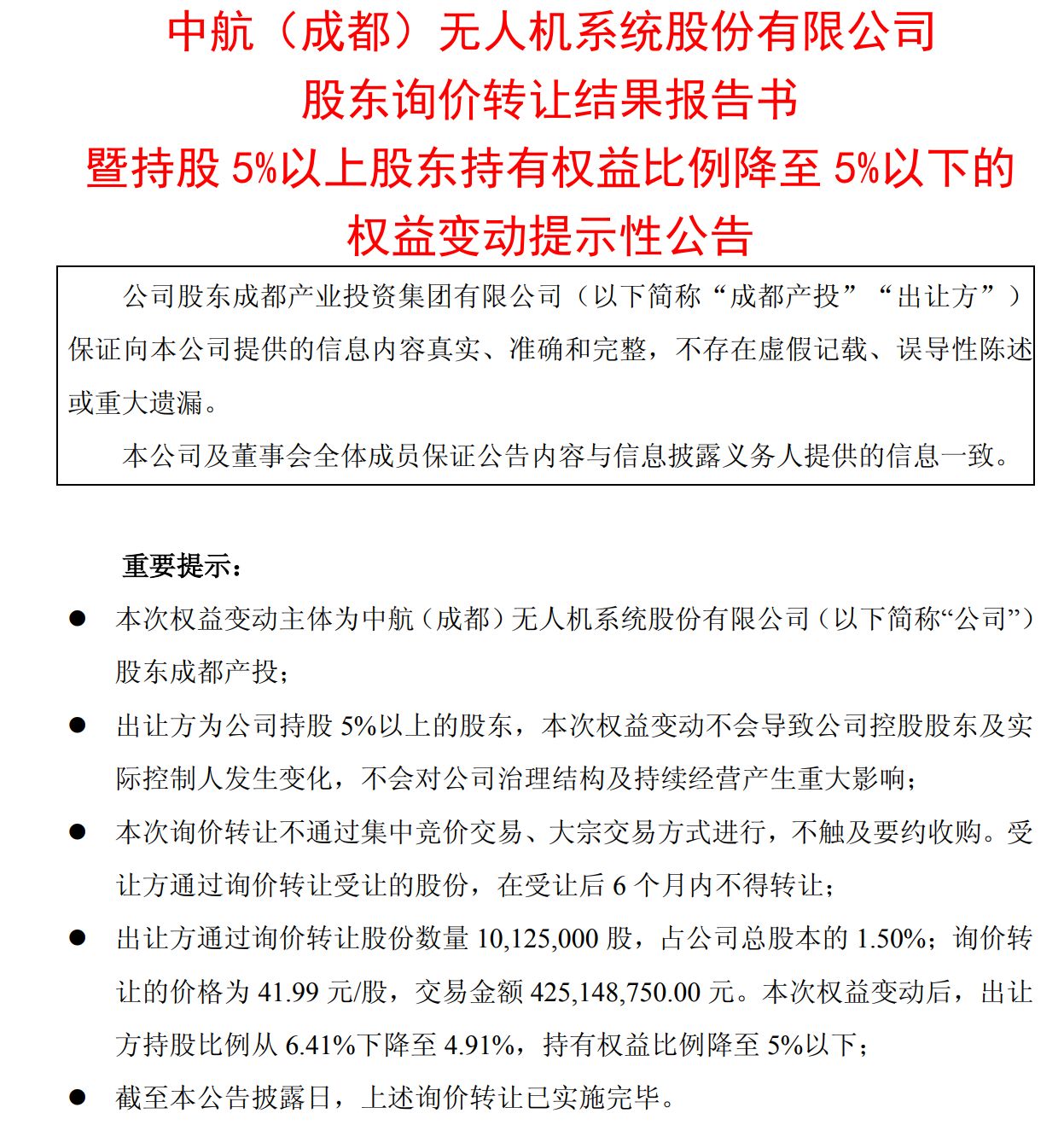 11月27日晚间,国内无人机龙头中无人机(688297.SH,股价46.04元,市值310.77亿元)披露成都产业投资集团有限公司(以下简称“成都产投”)询价转让结果,41.99元/股的定价吸引多家实力资本询价,最终17家投资者获配1012.5万股。其中,摩根大通等境外机构及诺德基金、华夏基金等头部公募扎堆入局。