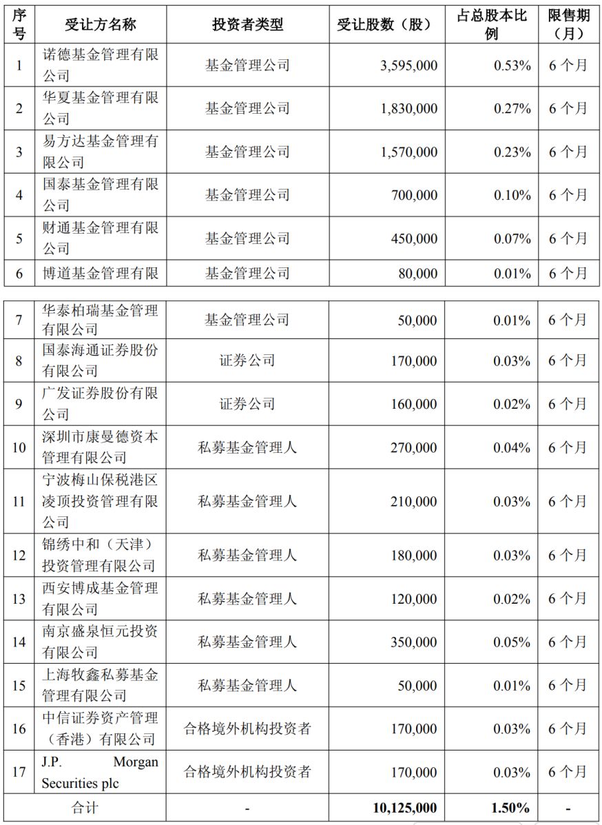 每经记者注意到,此次询价受让方包括诺德基金、华夏基金、博道基金等知名机构,国泰海通和广发证券两家券商,还有多家私募机构。